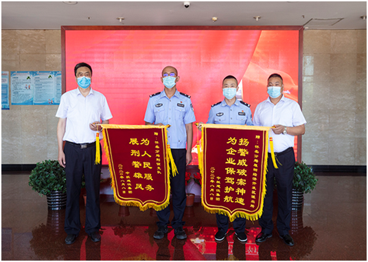8月10日上午,集团公司培训中心主任孔德明、工会主席郑春梅、租赁公司副总经理刘秀举、综合管理部助理孟醒代表中航建设集团来到北京市公安局怀柔分局,为怀柔分局雁栖经济开发区派出所和怀柔分局刑侦支队赠送锦旗,锦旗上分别绣有“扬警威破案神速,为企业保驾护航”、“为人民服务,展刑警雄风”的大字,对此次成功破获我集团租赁公司失窃案的全体民警、刑侦警官表示由衷的感谢!